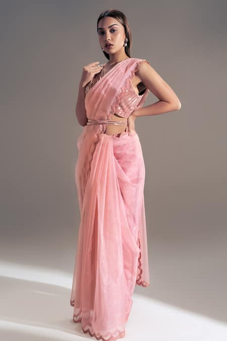 Pink Organza, Suede Floral V Neck Scallop Saree With Blouse