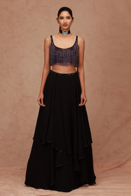 Black Tulle, Georgette Beads Scoop Neck Fringe Blouse And Layered Lehenga Set