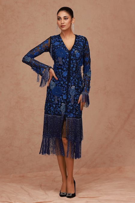Blue Tulle Fringe, Embroidery V-neck Floral Hem Dress
