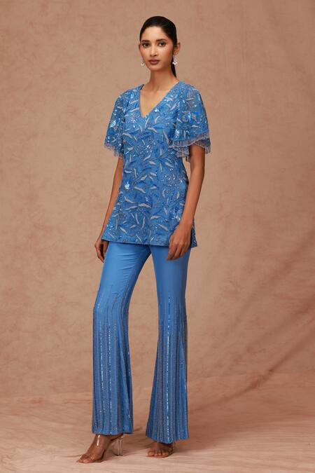 Blue Silk, Chiffon Sequins V-neck Floral Embroidered Tunic And Pant Set