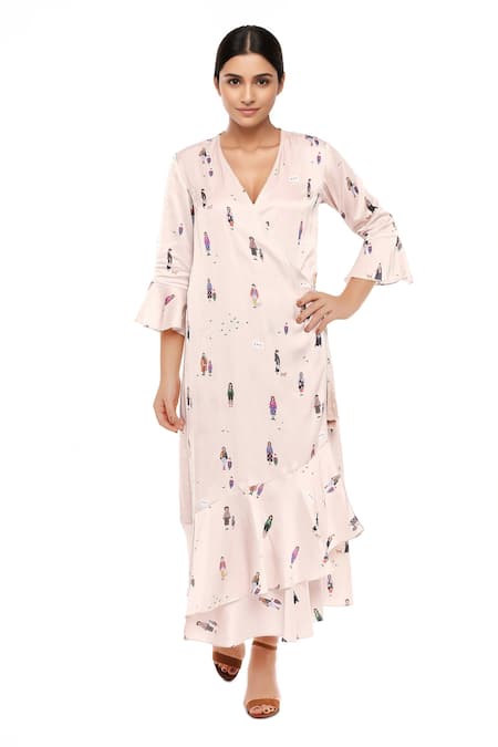 Off White Satin V Neck Overlap Printed Dress