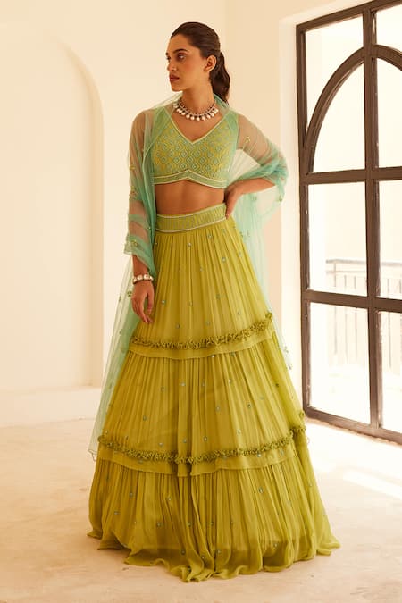 Green Georgette, Net, Silk, Linen Pearls, Tiered Lehenga Embroidered Blouse Set