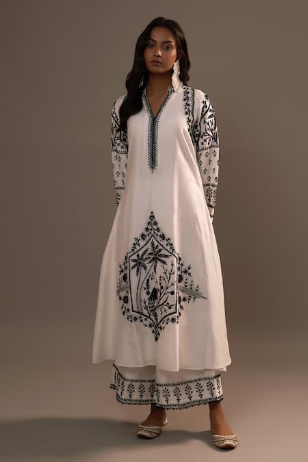 White Silk Sequins, Embroidery Mandarin Collar Surmai Kurta With Palazzo