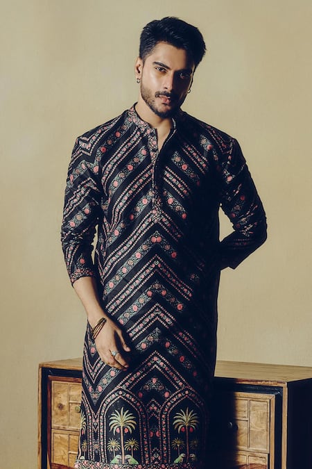 Black Silk, Chanderi Rama Geometric And Floral Print Kurta