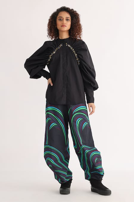 Black Cotton Embroidery Round Neck Tipid Raglan Puff Sleeve Shirt