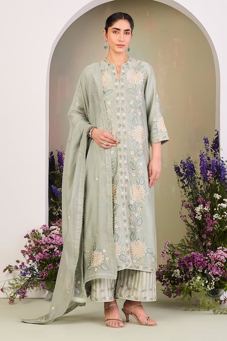 Green Silk, Silk, Embroidery Round Sage Floral Kurta Set