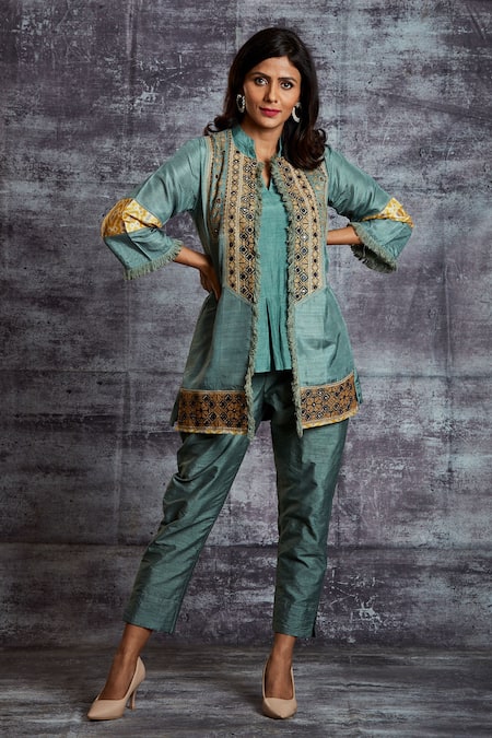 Grey Dupion Silk Mirror , Thread Round Cross Stitch Jacket Pant Set