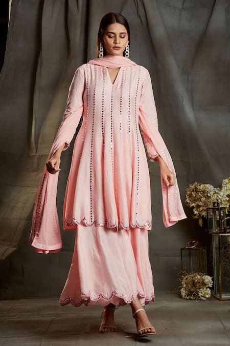 Pink Georgette, Dupion Silk Mirror Work, Thread Embroidered Anarkali Palazzo Set