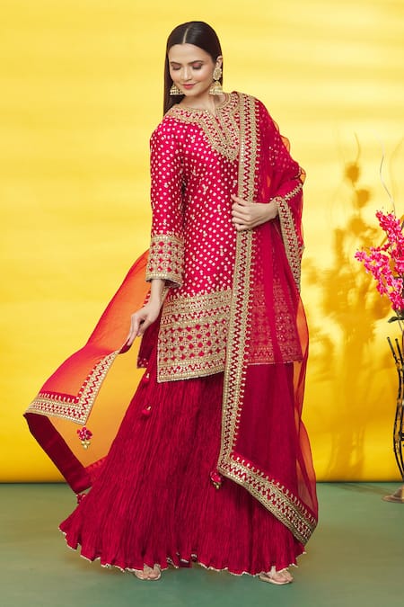 Maroon Silk, Organza Embroidery Round Neck Floral Kurta Skirt Set