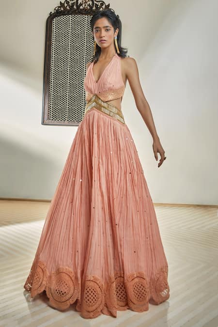 Pink Chanderi Hand Embroidery Badla V Neck Dress
