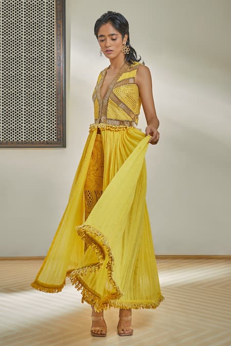Yellow Chanderi Embroidery Pipe Twisted Rope And Dress