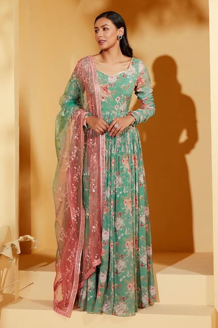Green Georgette, Organza Embroidery V-neck Floral Print Anarkali With Dupatta
