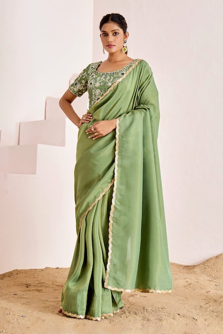 Green Georgette, Silk Sequins, Beads Round Border Saree With Embroidered Blouse