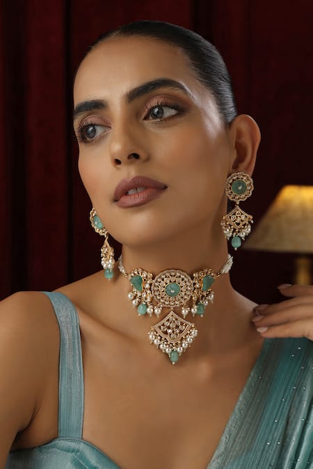 Green Pearls, Stones, Beads Floral Polki Studded Choker Set