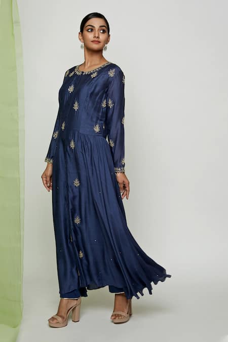Blue Cotton Silk Round Embroidered Anarkali And Pant Set