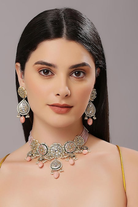 Gray Stones, Beads Embellished Choker And Earring Set