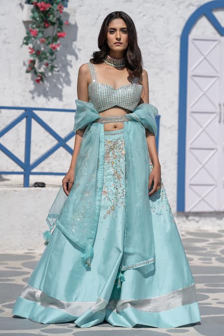 Blue Organza, Silk Taffeta V Neck Embroidered Lehenga Set