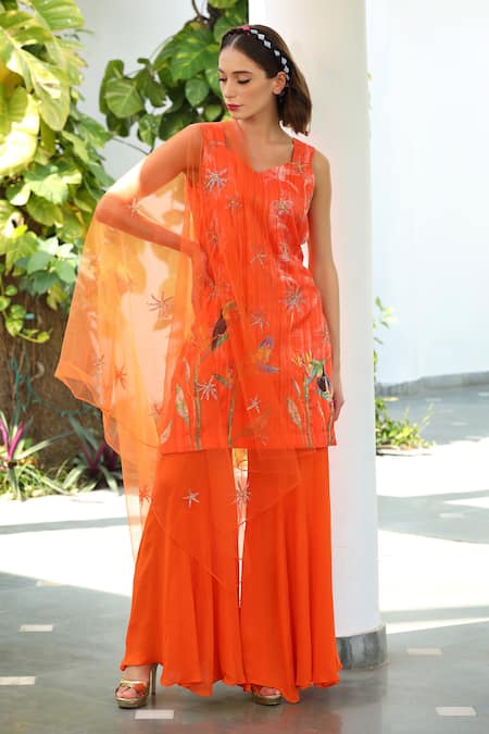 Orange Dupatta Net, Kurta Calcut Silk, Sharara Tropicana Print And Set