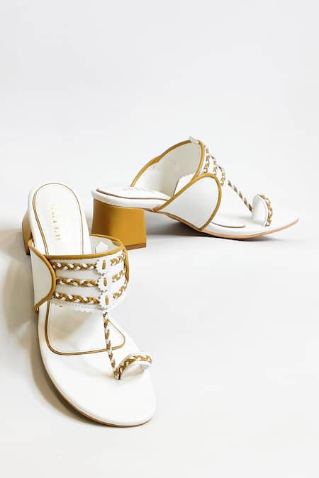 White Thread Myra Work Slip-on Kolhapuri Block Heels