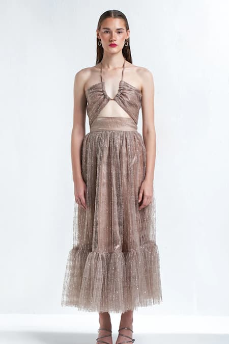 Beige Polyester Sequin Halter Neck Trance Embroidered Top And Skirt Set