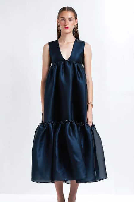 Black Polyester Plain Plunge V Neck Trinity Tiered Dress