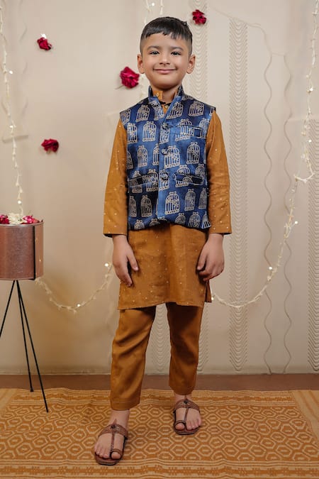 Blue Silk, Cotton Embroidery Block Print Kurta Set With Bundi