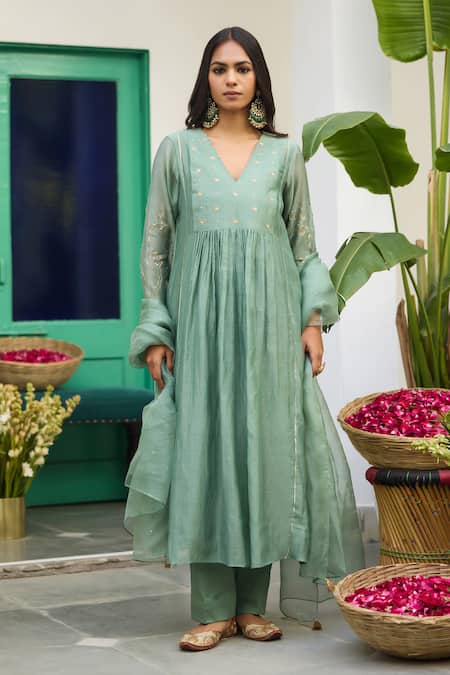 Green Silk, Chanderi, Cotton, Organza Embroidery Hand Kurta Set