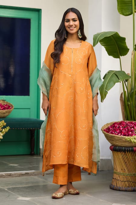 Orange Tissue, Cotton, Organza Embroidery, Sequins Kurta Set With Dupatta
