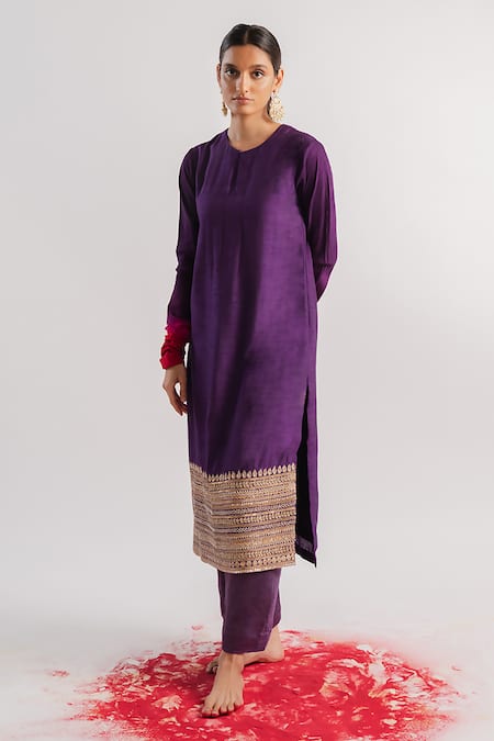 Purple Kurta Slub Silk Hand Embroidered Sequins Hem And Pant Set
