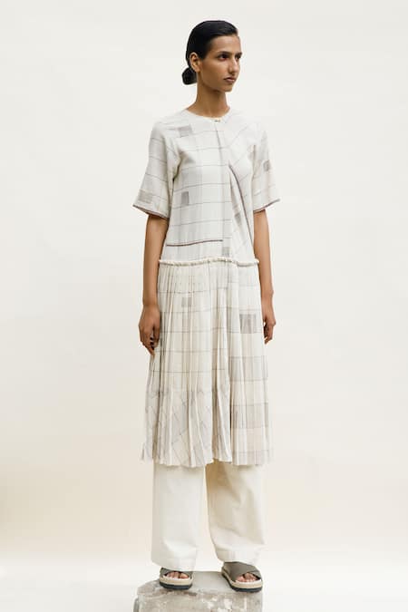Off White Cotton Round Neck Finn Geometric Block Print Dress