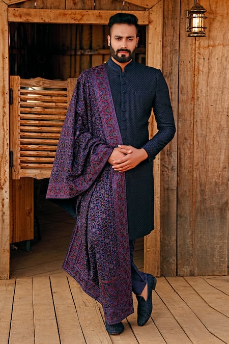 Blue Silk Embroidered Sherwani Set