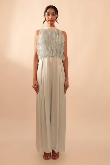 Blue Organza, Satin, Taffeta Ruffles, Pearls Round Neck Detailed Jumpsuit