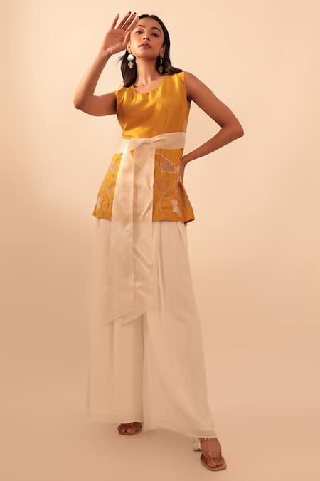 White Bamberg Silk, Lining Taffeta, Natural Crepe Hazel Tie-up Top And Pant Set