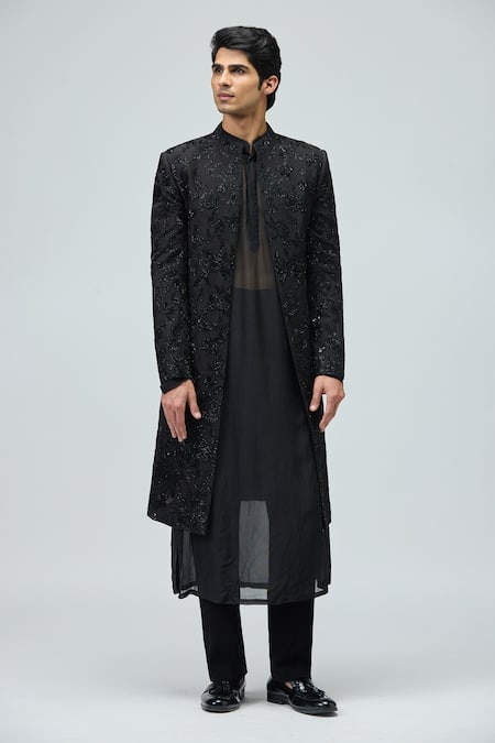 Black Modal, Dupion Sequins, Beads Floral Embroidered Sherwani Jacket