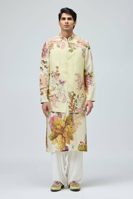 Green Modal, Dupion Floral Print Nehru Jacket