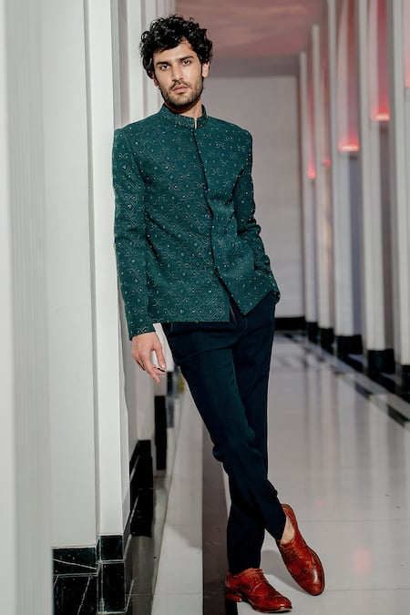 Green Poly Blend Suiting Geometric Abstract Embroidered Bandhgala Set
