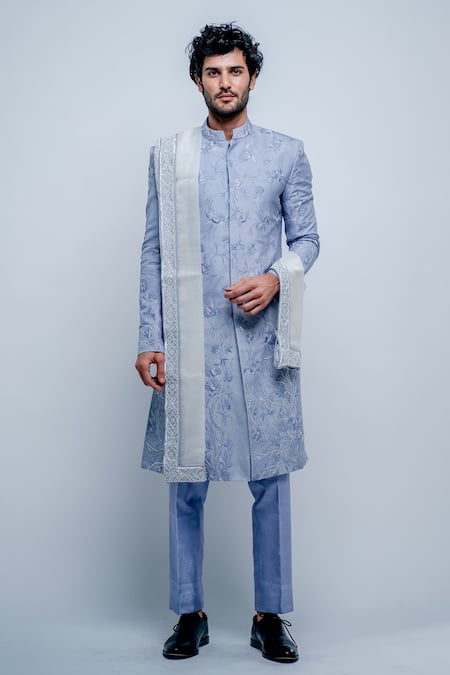 Blue , Organza Floral Embroidered Sherwani Set