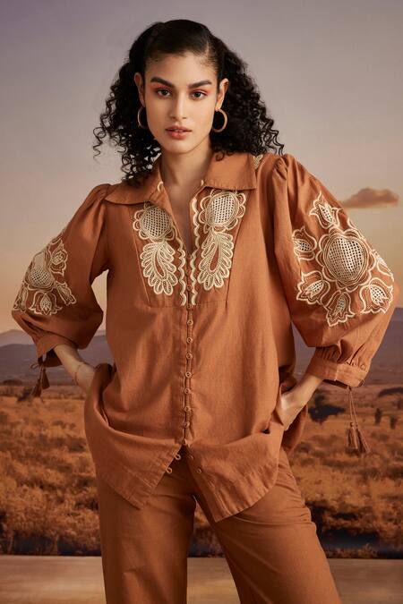 Brown Cotton Beads Collared Wildflora Embroidered Shirt