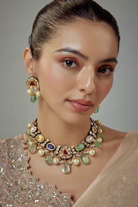 Gold Plated Kundan, Gemstone And Embellished Necklace Set