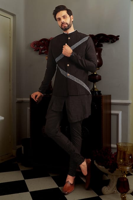Black Kurta And Bandi Silk, Pants Stretch Cotton Rave Embroidered Bundi & Set