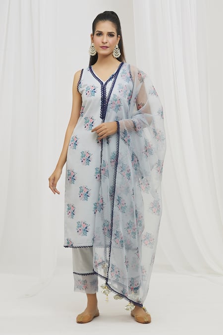 Blue Chanderi, Cotton, Organza Embroidery, Lace V-neck Floral Pattern Kurta Set