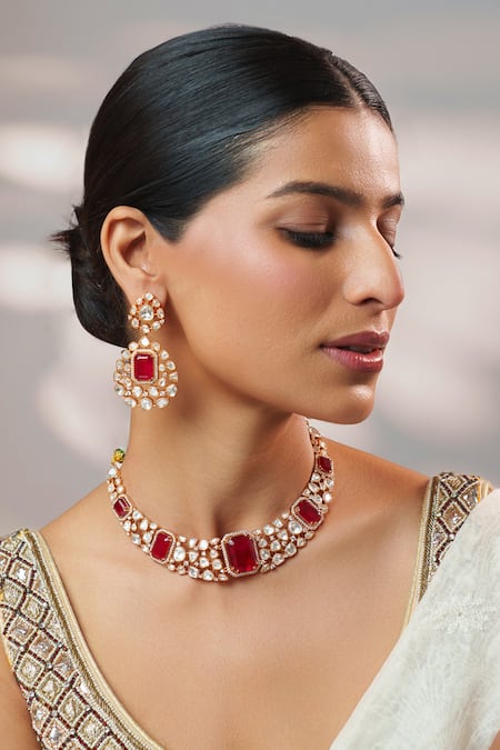 Red Stones, Crystals, Faux Diamonds Kundan Polki Embellished Necklace Set