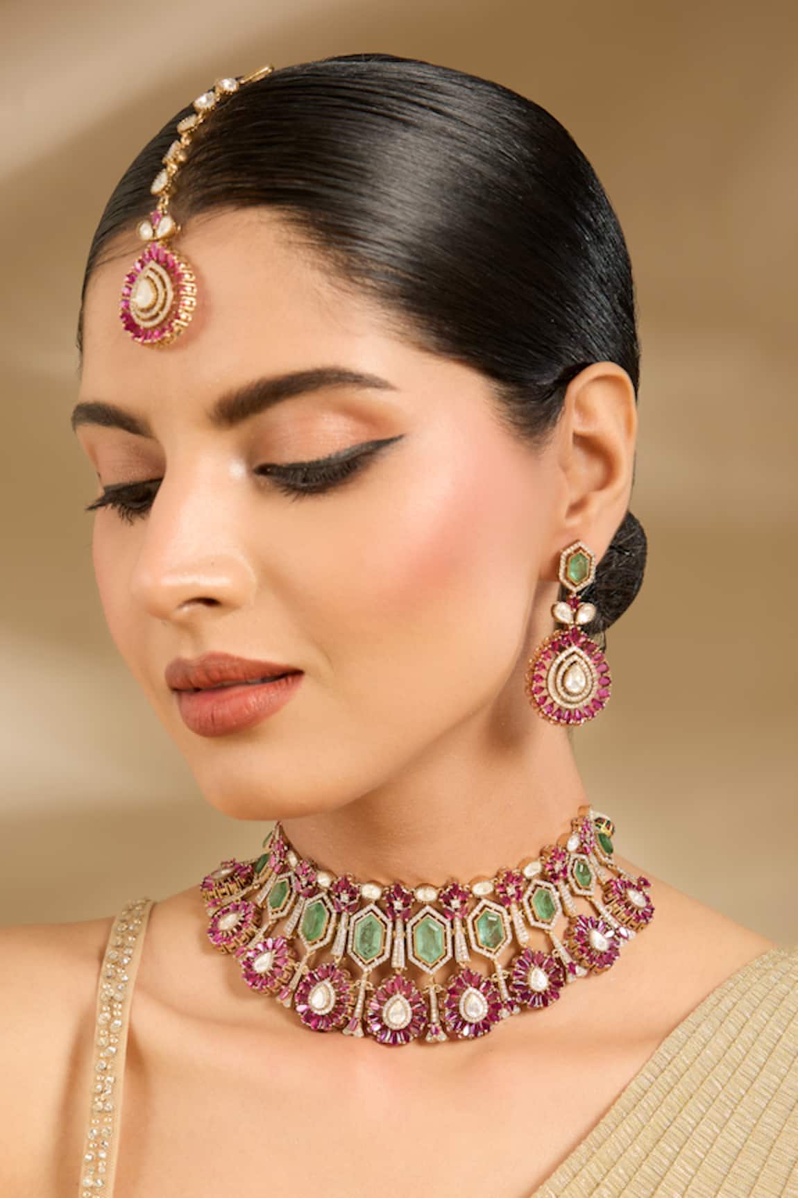 Green & Pink Stone Choker Necklace Set