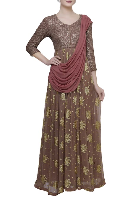 Brown Leaf Neck Hand Embroidered Anarkali Kurta With Attached Dupatta