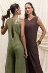 Green Linen Embroidery V-neck Designer Jumpsuit