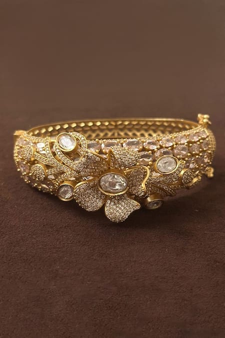 Pink Stones, Crystals, 3d Floral Moissanite Brass Bangle