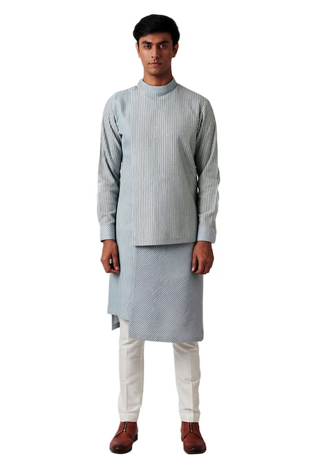 Blue Wool Blend Pintuck Kurta And Pant Set