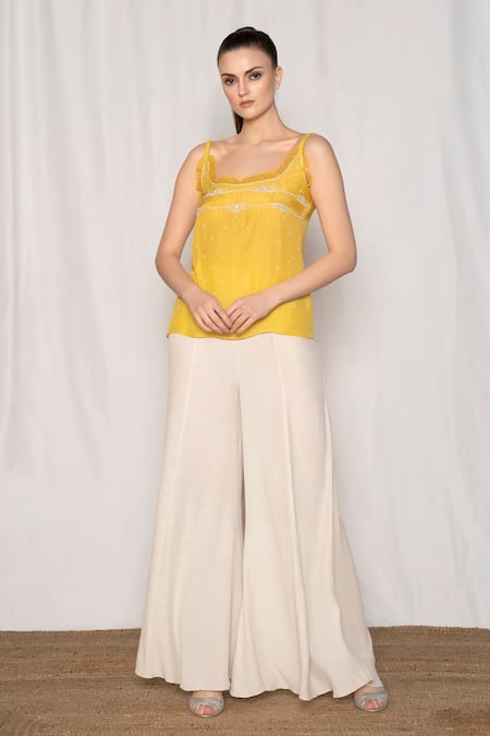 Yellow Viscose Pearls, Beads, Zari Scoop Neck Embroidered Top And Flared Pant Set