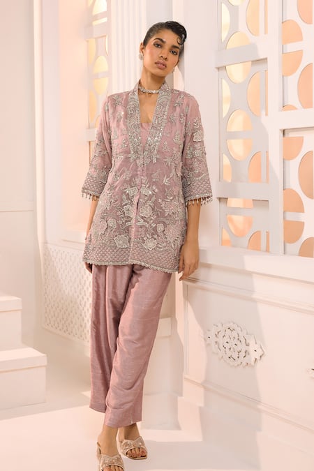 Pink Organza, Silk Embroidery, Zari, Stones Maya Floral Jacket And Pant Set