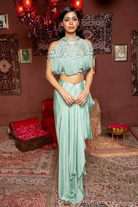 Blue Bustier And Cape Crepe, Skirt Modal Satin Embroidered & Draped Set
